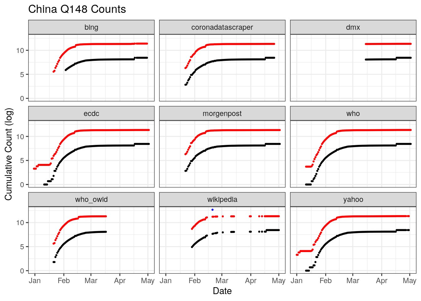 China outright refuses to release daily counts of testing. Only three databases document the beginning of the outbreak, the ECDC, the WHO, and Yahoo. On April 17, China changed its reporting which added 1,290 more deaths for Wuhan city only. The change is not retrospective, it shows up only a sharp discontinuity across multiple datasets.