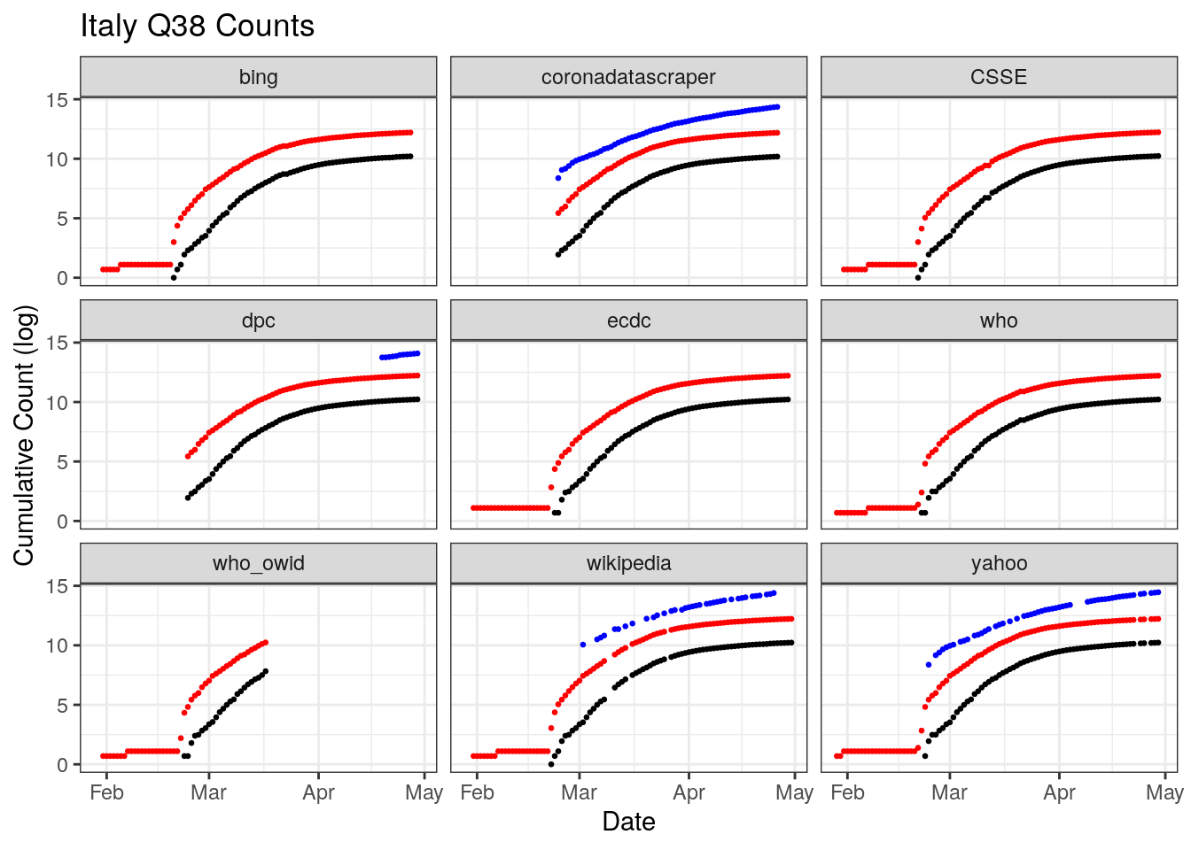 The U.S. has a great deal of coverage, but also a great deal of disagreement in that coverage. There is a stair step pattern in confirmed and deaths for Bing, WHO, and Wikipedia. In others reporting from day to day looks more continuous. There is also a change in reporting in late February that shows us a sharp vertical discontinuity across most datasets, though the size of the jump varies. There is also less temporal coverage of testing than is available from the caronavirus tracking project at the state level. Why those state level estiamtes aren’t totaled and available at the national level is a question.