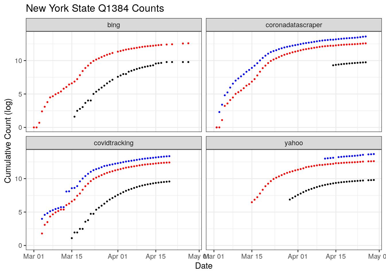 New York has been the most heavily hit by COVID-19 in the U.S. Two sources, CornaDataScraper and the Covid Tracking Project have coverage over nearly the entire period. However, only one shows a sharp discontinuity in testing around March 10th. Digging into that disagreement more, the CTP rates New York’s data release a B quality, coming from snapshots of press conferences and then switching to screenshots of New York’s “Department of Health Covid-19 Tracker” website.