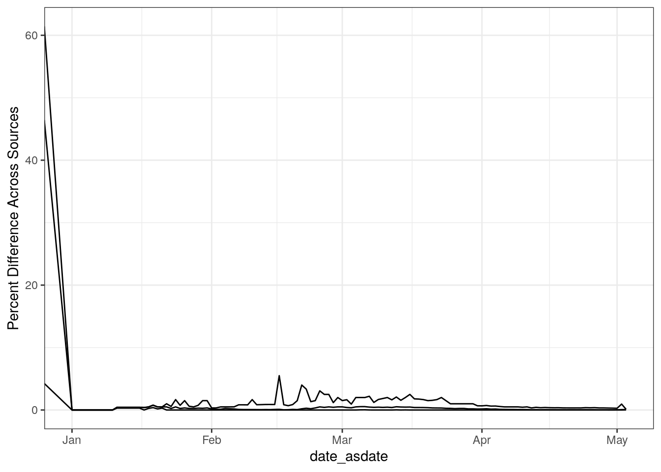 We take a conservative approach to data cleaning, rejecting noisy and contradictory observations as more representative of the data entry and institutional data generating processes than the underlying empirical data generating process that we actually care about. Our raw database begins with 917555 rows. Removing rows with missing date information and collapsing duplicate dates from the same database taking the max of each value reported, reduces that number to 824523 rows. We then further reject any row with: negative counts, death counts greater than confirmed, or a cumulative count not strictly greater than or equal to the day prior. Our theory of missingness is that very small or zero values are not meaningfully distinguishable from missing. We therefore set any 0 values to NA, and drop any rows with less than 2 confirmed cases. This reduces the count further to 684929 dataset-location-day observations.