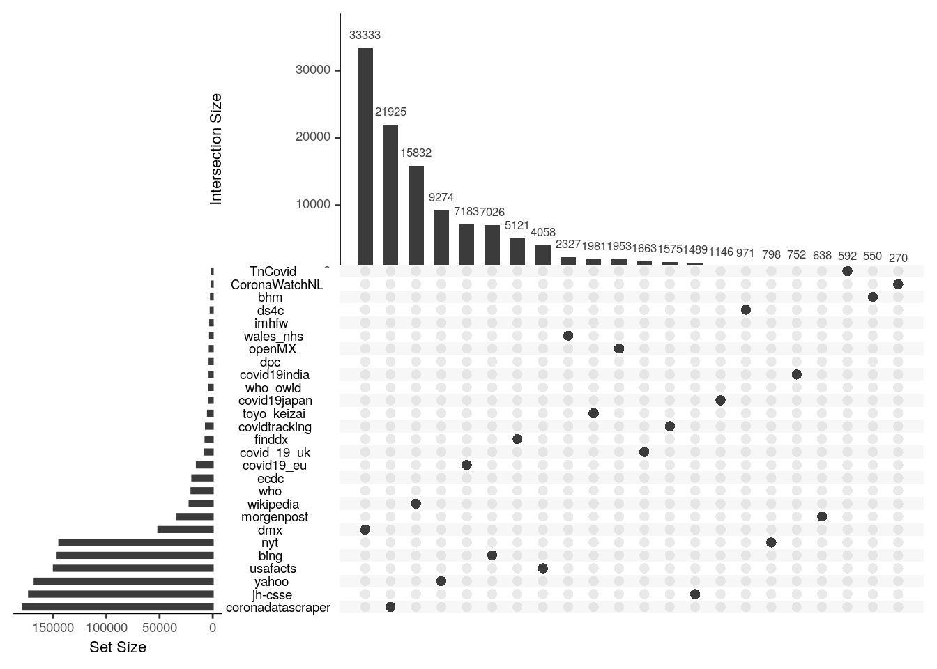 Which databases will provide the most unique information is difficult to tell apriori. The Upset plot below shows the number of unique location-day-variable observations provided by each database along the vertical axis and the number found only in that database an no other. In general, the databases with the most observations and that rely on direct collection from raw sources rather than aggregation of others, tend to provide the most unique information. For example, Corona Data Scraper provides both the most total and most unique observations. The most unique contributions come from the Corona Data Scraper Project, which might be anticipated by their overall size. The second most unique observations however comes from Wikipedia which is surprising because our treatment of it is currently ad hoc and it should already be ingested by other sources. It goes to show that no single source, or even no small combination of sources, is sufficient to provide full temporal and spatial coverage over even this relatively brief period of the Covid-19 pandemic.